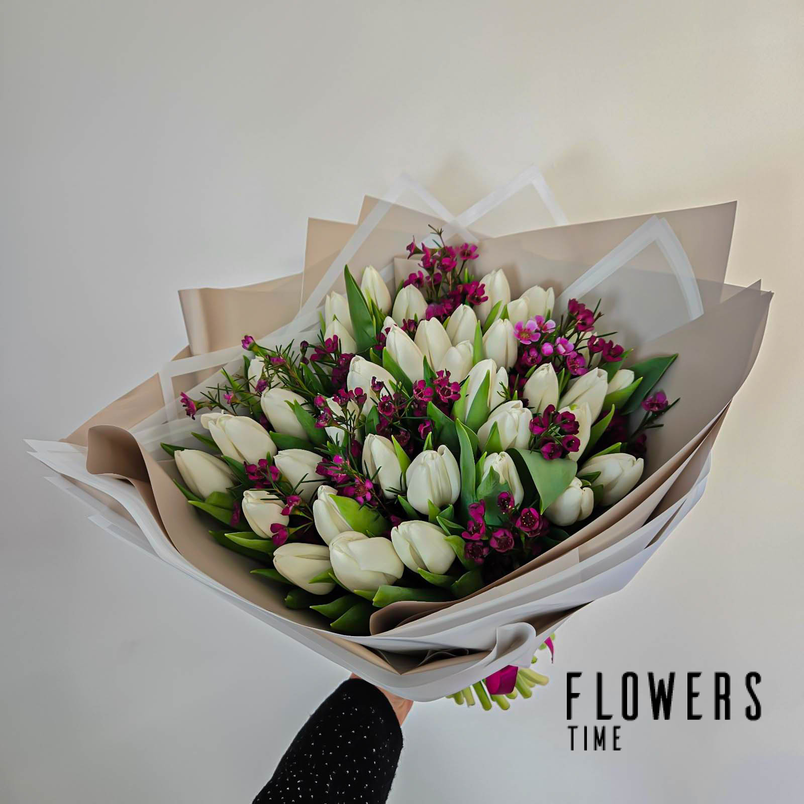 White tulips and fragrant wax flowers make a very moody and spring-like bouquet. Gift it for your loved ones for all kinds of special occasions.
