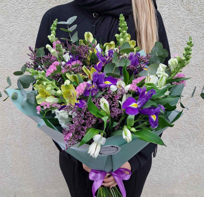 This wildflower bouquet is made up of blue irises, daisies, waxflowers and greenery. A romantic and fresh composition, with which you will surprise those who like simplicity and naturality. Give this bouquet as a gift on a wide variety of occasions, which will suit both men and women.