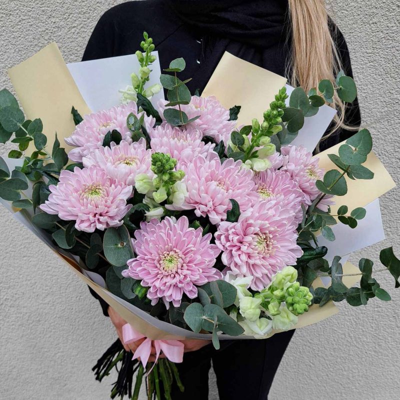 Raudonų rožių, rožinių eustomų ir vaškagėlių puokštė