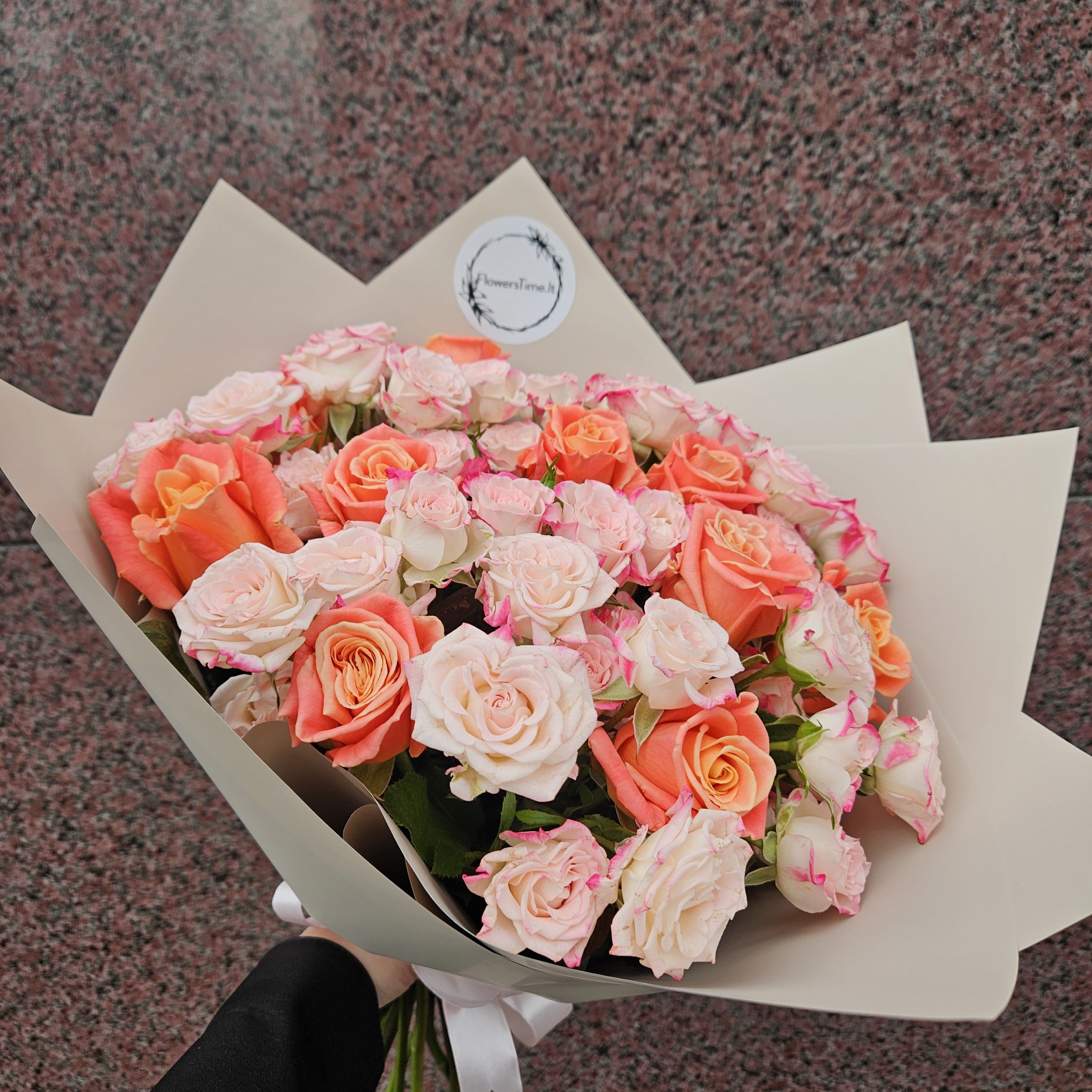 Smulkios rožės suteikia kompozicijai švelnumo ir subtilumo, o koralinės rožės prideda žaismingumo, gaivaus atspalvio. Kartu jos sukuria nuotaikingą, vasarišką įspūdį, tinkantį pasveikinti kiekvieną žmogų.