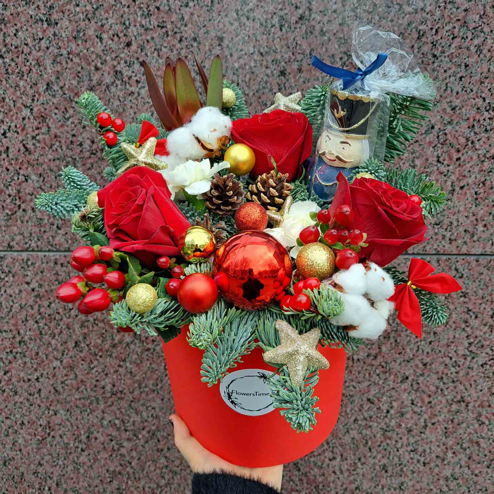 Šventinė gėlių dėžutė su kėnio šakomis, raudonomis rožėmis, žvake – spragtuku ir kalėdiniais papuošimais. Jaukumas, elegancija ir tikra Kalėdų dvasia vienoje kompozicijoje – tobula dovana šventiniam laikotarpiui.